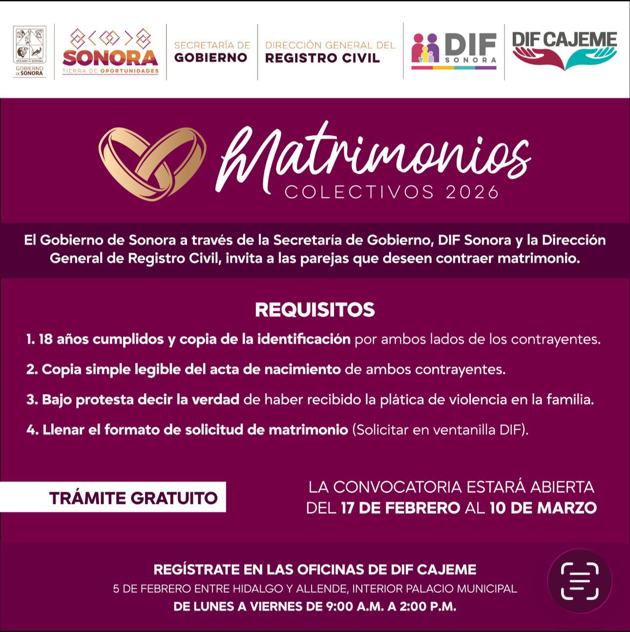 Para que más parejas puedan aprovechar esta oportunidad, se amplía un día más la recepción de documentos para los Matrimonios Colectivos Sonora 2026.