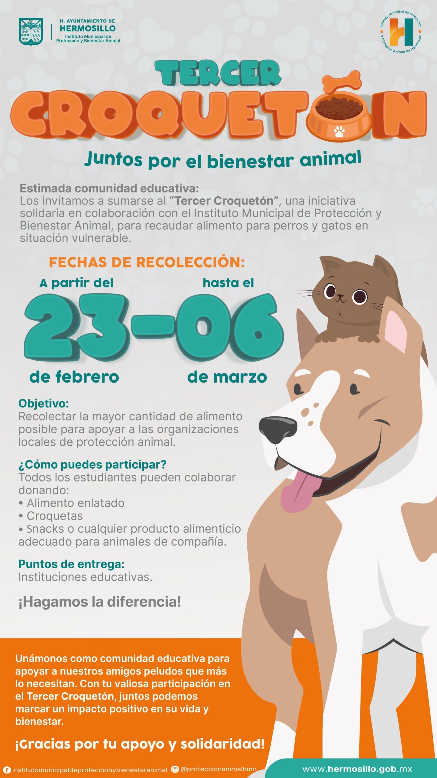 A partir del lunes 23 hasta el viernes 6 de marzo es el periodo para participar en el Tercer Croquetón que realiza Gobierno de Hermosillo a través del Instituto Municipal de Protección y Bienestar Animal, IMPBA, informó David Palafox Celaya.