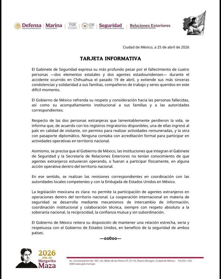 El Gabinete de Seguridad reportó el fallecimiento de cuatro personas, dos elementos estatales y dos agentes estadounidenses, tras un accidente ocurrido en Chihuahua el 19 de abril.