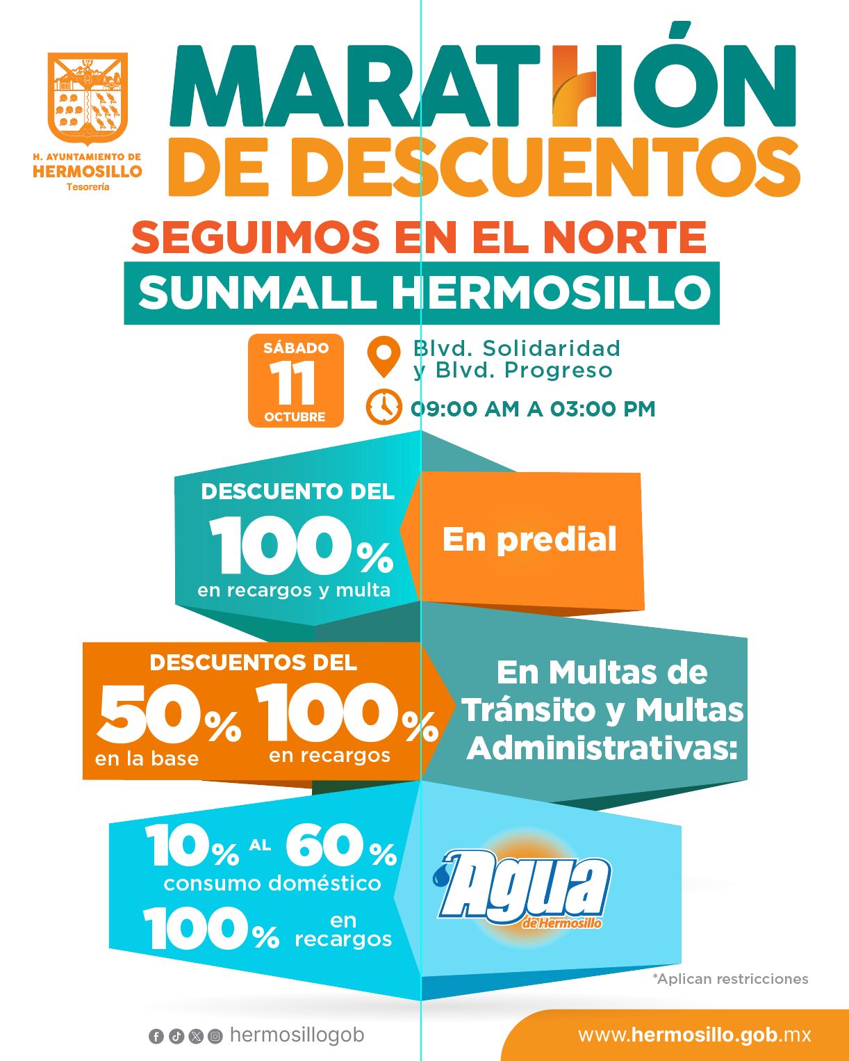 El Gobierno Municipal de Hermosillo realizará el próximo sábado 11 de octubre un nuevo “Maratón de Descuentos” en la plaza comercial Sun Mall, de las 9:00 a las 15:00 horas, informó Yazmina Anaya Camargo.